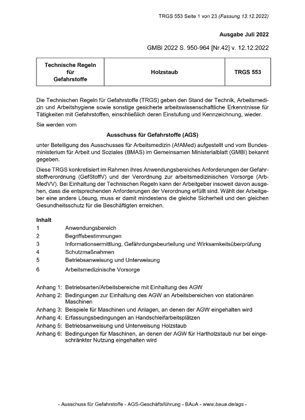 Per Klick auf das Bild können Sie sich die „TRGS 553 Holzstaub“ als PDF-Datei herunterladen.