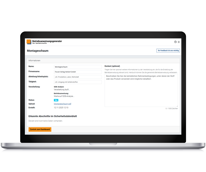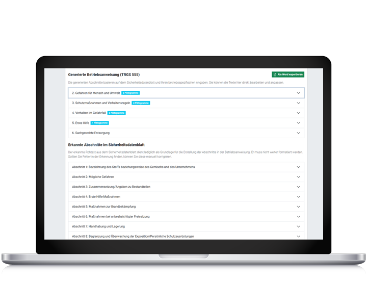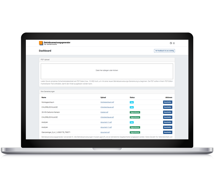 Der Betriebsanweisungsgenerator automatisiert Ihren Erstellungsprozess: Einfach das Sicherheitsdatenblatt hochladen und von unserer KI analysieren lassen. Die KI erkennt automatisch alle Gefahren, Schutzmaßnahmen und Pflichtangaben und extrahiert diese per Mausklick direkt in eine downloadbare, editierbare Betriebsanweisung im gängigen Word-Format (docx).