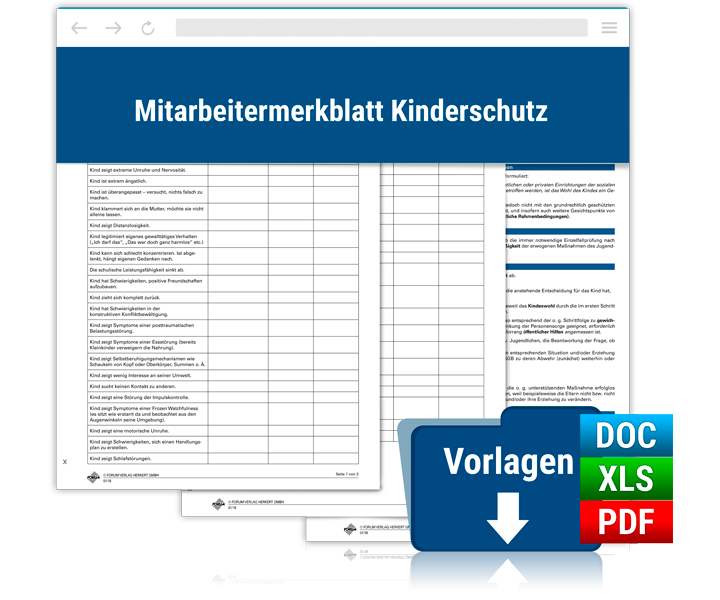 Das Mitarbeitermerkblatt Kinderschutz ist für alle Mitarbeitenden einer Einrichtung geeignet, die mit Kindern zu tun haben. Die Grundsätze des Kinderschutzes werden verständlich erklärt. Ein besonderer Fokus liegt dabei auf situationsbezogenen Anwendungshilfen, um Ihrem Team mehr Sicherheit im Umgang mit Graubereichen zu geben. Die Inhalte eignen sich sowohl als Auffrischung für erfahrene Pädagogen als auch als Erstinformation für neue oder ehrenamtliche Mitarbeitende. Eine heraustrennbare Verpflichtungserklärung kann der Personalakte beigelegt werden.